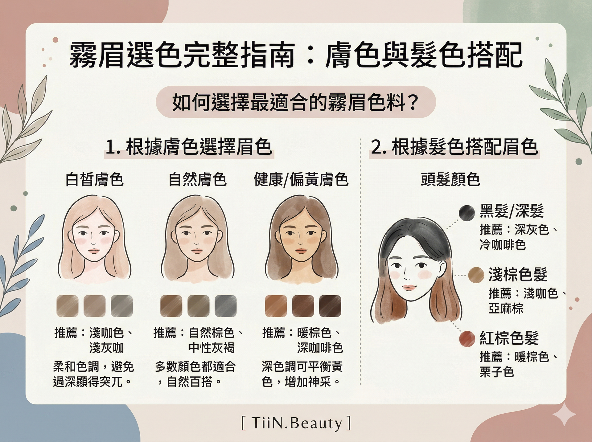 ![一張奶油色簡約風格的 Blog 懶人包圖文,標題為「第三步:髮色與眉色的黃金配對法則」。圖片使用莫蘭迪色系,包含手繪插畫和清晰易讀的繁體中文文字。它分為四個主要面板:1. 原生黑髮 / 深咖啡髮(灰咖色、深冷棕);2. 淺色髮(金、淺棕、奶茶色)(淺棕色、米卡其棕);3. 紅髮 / 暖銅色髮(暖棕色、巧克力色);4. 銀髮 / 灰白髮(熟齡客群)(柔和灰棕、淺灰咖)。每個面板都有對應的女性插畫和色塊,以及選色原則說明。圖片底部中央有「[ TiiN.Beauty ]」字樣。](https://lirp.cdn-website.com/e151c63c/dms3rep/multi/opt/05%E7%AC%AC%E4%B8%89%E6%AD%A5-%E9%AB%AE%E8%89%B2%E8%88%87%E7%9C%89%E8%89%B2%E7%9A%84%E9%BB%83%E9%87%91%E9%85%8D%E5%B0%8D%E6%B3%95%E5%89%87-1920w.png)